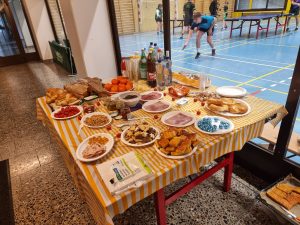 Auch das Buffet wurde reichlich bestückt durch die zahlreichen Mitbringsel – Danke! Ebenfalls auf dem Bild zu sehen: die Anstrengungen von Köbu – unserem verlorenen Sohn – die Zuschauer(innen) mit Kraftübungen zu beeindrucken …
