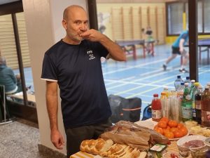 Andere wiederum versuchten sich die Zeit mit (Fr)essen totzuschlagen, wobei das untere Bild etwas täuscht, denn der eine oder andere auf diesem Bild vergriff sich hin und wieder auch zu etwas Flüssigem, das dann doch noch einen Einfluss hatte auf das spätere Abschneiden in der Hauptrunde …